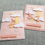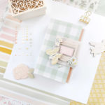 On va maintenant décorer la première page de l’album. Pour cela, utiliser le combo clear & dies: tamponner et utiliser le die assorti pour créer la jolie fenêtre. La mettre en couleurs et coller à l’arrière un petit morceau de papier calque pour simuler la vitre. Fixer le tout sur la page et y ajouter une étiquette ronde ainsi que la petite libellule en acrylique. Cette pochette va contenir 2 cartes que nous allons décorer et sur lesquelles seront fixées 2 photos. Pour cela j’ai découpé 2 cartes dans le papier n°3. A l’arrière, je vais coller mes photos et quelques décorations plates. En effet, il vaut mieux ne pas coller d’embellissements trop épais au risque de ne pas pouvoir glisser facilement les cartes dans la pochette. J’aime beaucoup le tampon de la jeune fille au chat du combo clear & dies, j’ai donc voulu la mettre en valeur au centre de ma carte avec un peu de papier calque derrière pour adoucir le fond.Voici d’autres exemples de décoration des pages pour vous inspirer.